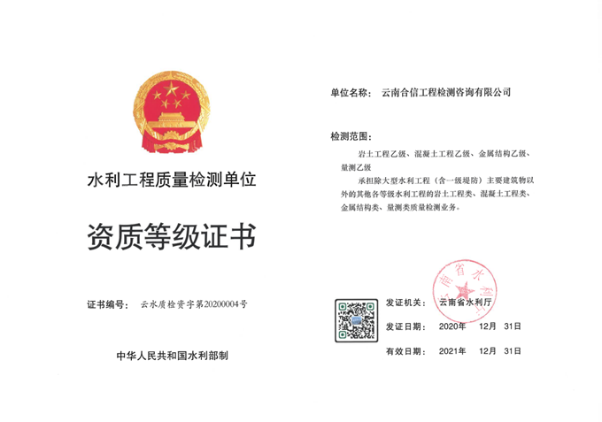 國(guó)檢集團(tuán)•云南合信公司喜添水利工程質(zhì)量檢測(cè)乙級(jí)資質(zhì)